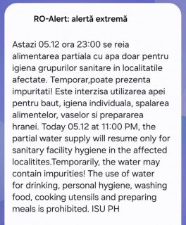 Într-un amplu comunicat al IGSU se afirmă că, în continuarea misiunilor demarate în contextul întreruperilor în alimentarea cu apă, structurile operative ale Ministerului Afacerilor Interne au acționat zi și noapte pentru a sprijini comunitățile afectate din județele Prahova și Dâmbovița.